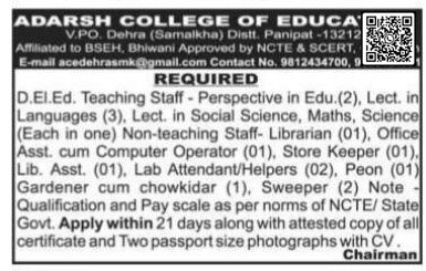 AdarshCollege Of Education PanipatVacancy 2026: Adarsh College of Education, V.P.O. Dehra (Samalkha), PanipatAffiliated with BSEH, Bhiwani and approved by NCTE & SCERT, Gurugram has released a notification for Non-Teaching Posts. Interested and eligible candidates can apply offline within 21 days from the date of advertisement. Complete details like eligibility, qualification, application process, and important dates are given below.