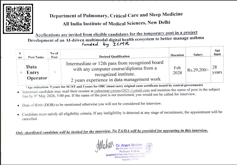 AIIMS Delhi DEO Recruitment 2026: AIIMS Delhi Data Entry Operator Recruitment 2026: The Department of Pulmonary, Critical Care and Sleep Medicine, All India Institute of Medical Sciences (AIIMS), New Delhi has released an official notification for the recruitment of Data Entry Operator on a temporary project basis. This project is funded by ICMR for the development of an AI-driven digital health system for asthma management..