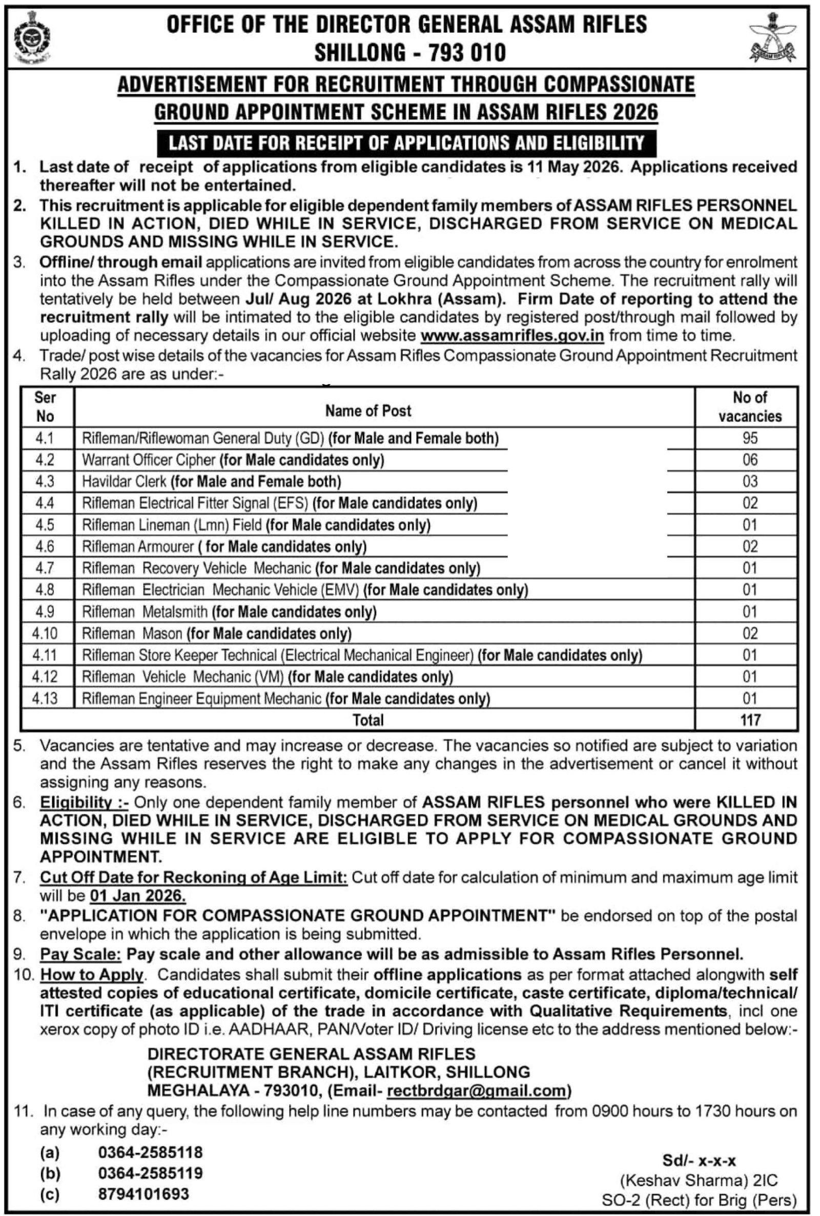 Assam Rifles Compassionate Ground Recruitment 2026 Offline Form: The Office of the Director General Assam Rifles, Shillong has released the official notification for Recruitment Through Compassionate Ground Appointment Scheme in Assam Rifles 2026. This recruitment is only for the eligible dependent family members of Assam Rifles personnel who were killed in action, died while in service, discharged from service on medical grounds, or missing while in service.