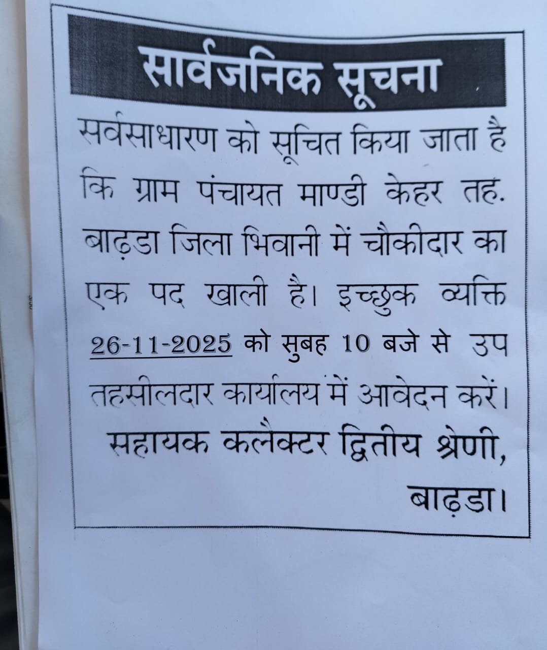 | Job Location | Gram Panchayat Mandi Kehar, Tehsil Badhra, District Bhiwani, Haryana |