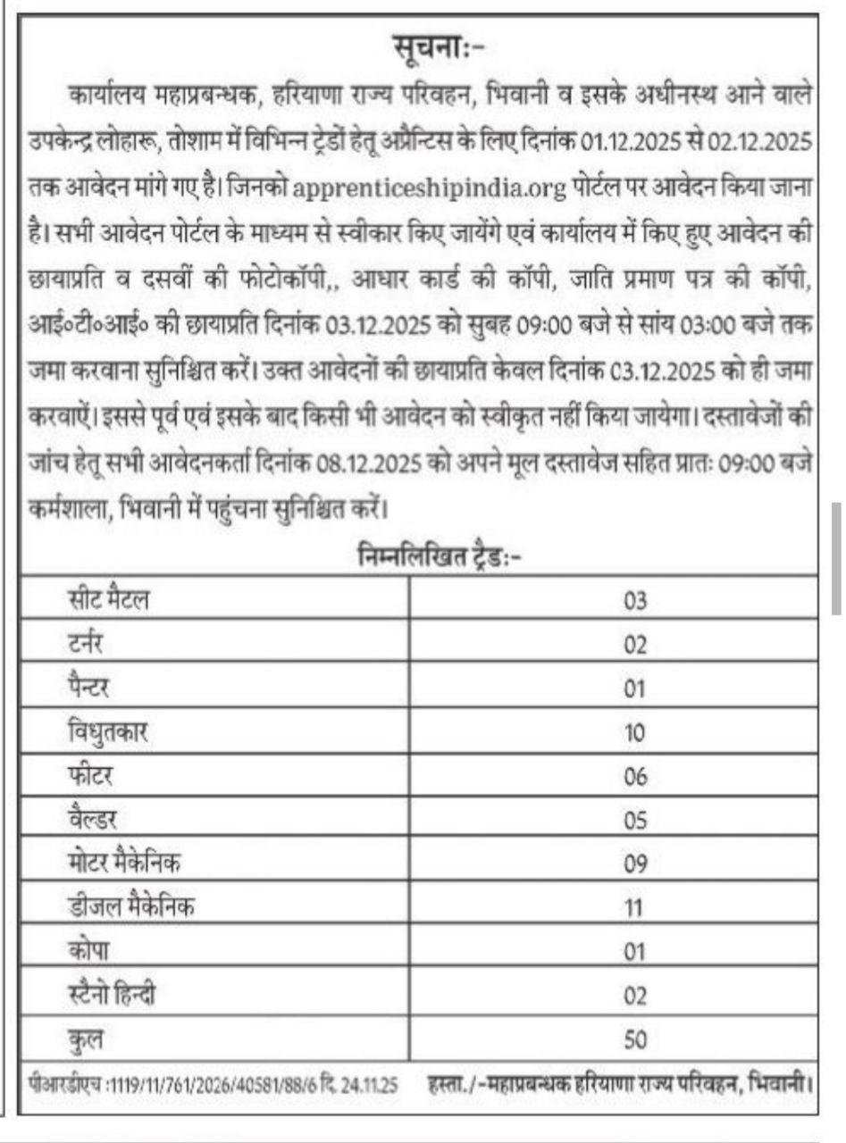 Bhiwani Roadways Apprentice 2025: Haryana Roadways (Bhiwani) General Manager has released a notification for ITI Pass Students Apprentice Vacancy for the 2025-26 session. Eligible candidates can apply online for the Bhiwani Roadways Apprentice 2025 from the link given below. All the details related to the Bhiwani ITI Apprentice 2025 are provided here.