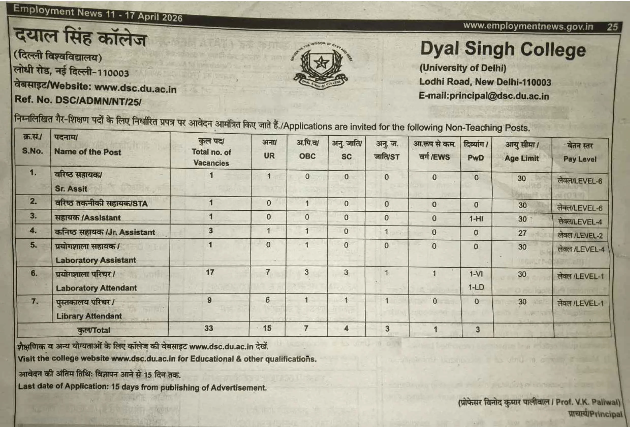 Dayal Singh College Non-Teaching Recruitment 2026: The Dayal Singh College, under University of Delhi (DU) has released the latest notification for the recruitment of 33 Various Non-Teaching Posts. Eligible candidates can apply online for Dayal Singh College Non-Teaching Vacancy 2026 starting from 11 April 2026. All the details related to Dayal Singh College Non-Teaching Bharti 2026 are given below.