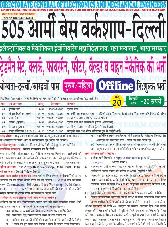 Delhi 505 army Base Workshop Delhi Cantt Vacancy 2025 Offline Form: The Delhi 505 Army Base Workshop Delhi Cantt has released the latest notification for the recruitment of Various Group C Posts Including Trademan Mate, LDC, Fireman, Fitter, Welder, Vehicle Mechanic Vacancy Offline Form For All India Candidates. Eligible candidates can apply offline for the Delhi 505 army Base Workshop Delhi Cantt 2025 from the Indian Army Official website indianarmy.nic.in starting from 30 September 2025. All the details related to Delhi 505 army Base Workshop Delhi Cantt Bharti 2025 are given below.