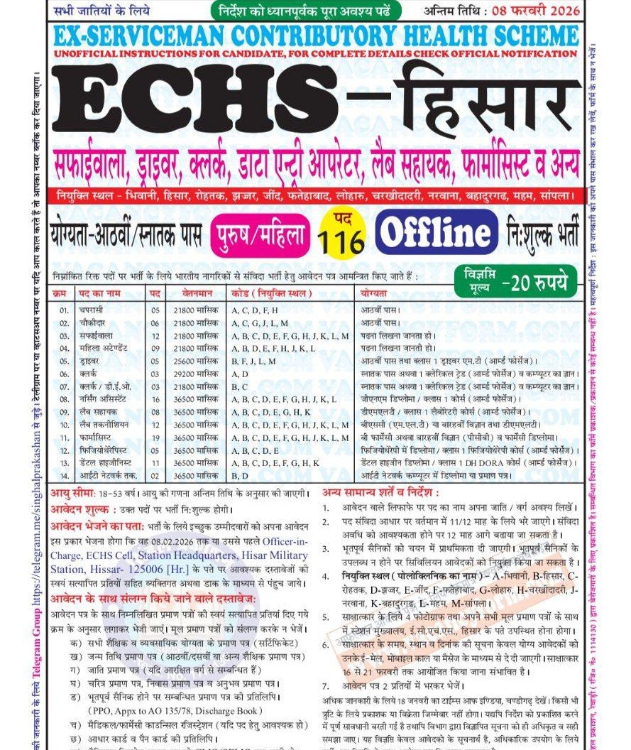 ECHS Hisar Recruitment 2026: The Ex-Servicemen Contributory Health Scheme has released the latest notification for the recruitment of Various 116 Posts Including Pharmacist, Chowkidar, Safaiwala, Female Attendant, Driver, Clerk, Lab Technician, Nursing Assistant, Lab Assistant, Dental Technician, Physiotherapist, Dental Hygienist, Peon, Ward Boy posts Offline Form For All India Candidates. Eligible Indian male and Female candidates can apply offline for the ECHS Hisar Vacancy 2026 from the ECHS Official website echs.gov.in starting from 19 January 2026. All the details related to ECHS Hisar Bharti 2026 are given below.