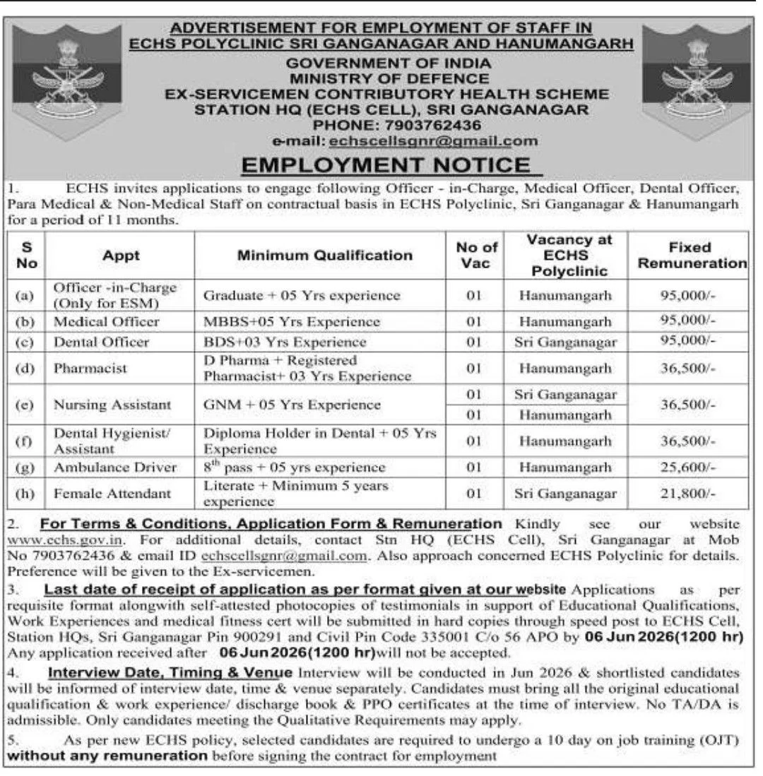 ECHS Rajasthan Recruitment 2026: ECHS Polyclinic Sri Ganganagar & Hanumangarh (Ministry of Defence, Government of India) has released a notification for the recruitment of various posts including Medical Officer, Dental Officer, Pharmacist, Nursing Assistant, Driver, and other staff on a contractual basis. Interested and eligible candidates can apply offline. Complete details regarding eligibility, qualification, age limit, salary, and application process are given below.