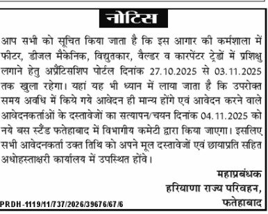 Fatehabad Roadways Apprentice 2025: General Manager Haryana Roadways, Fatehabad Has Released a Notification For ITI Trade Apprentice Online Form 2025 For 40+ Vacancies. Only Haryana Candidate Can Fill This Form. Interested & Eligible Candidate Can Fill Online Form from 27 October 2025. All Information Notification, Eligibility, Qualification, Age Limit, Salary, Apply Online, Important Dates, Application Fees, How to Apply, Exam Date, Admit Card, Answer Key, Syllabus, Results, Previous Papers, etc. are given below.