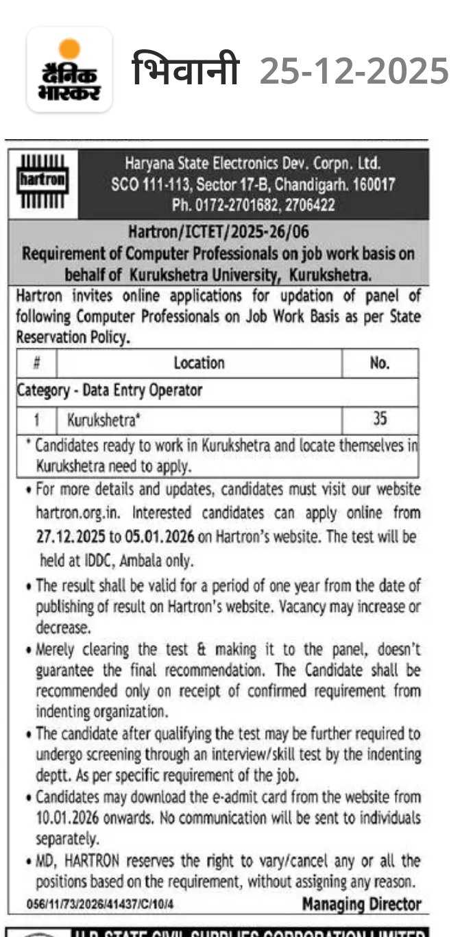 Hartron DEO Vacancy 2026 Official Notification: The HARTRON (Haryana State Electronics Development Corporation Ltd.) has released the latest notification for the recruitment of 25 Data Entry Operators (DEO) vacancies across many districts of Haryana. Eligible candidates can apply online through the official HARTRON website: hartronservices.com. All the important details regarding the HARTRON DEO Vacancy 2026 are provided below.