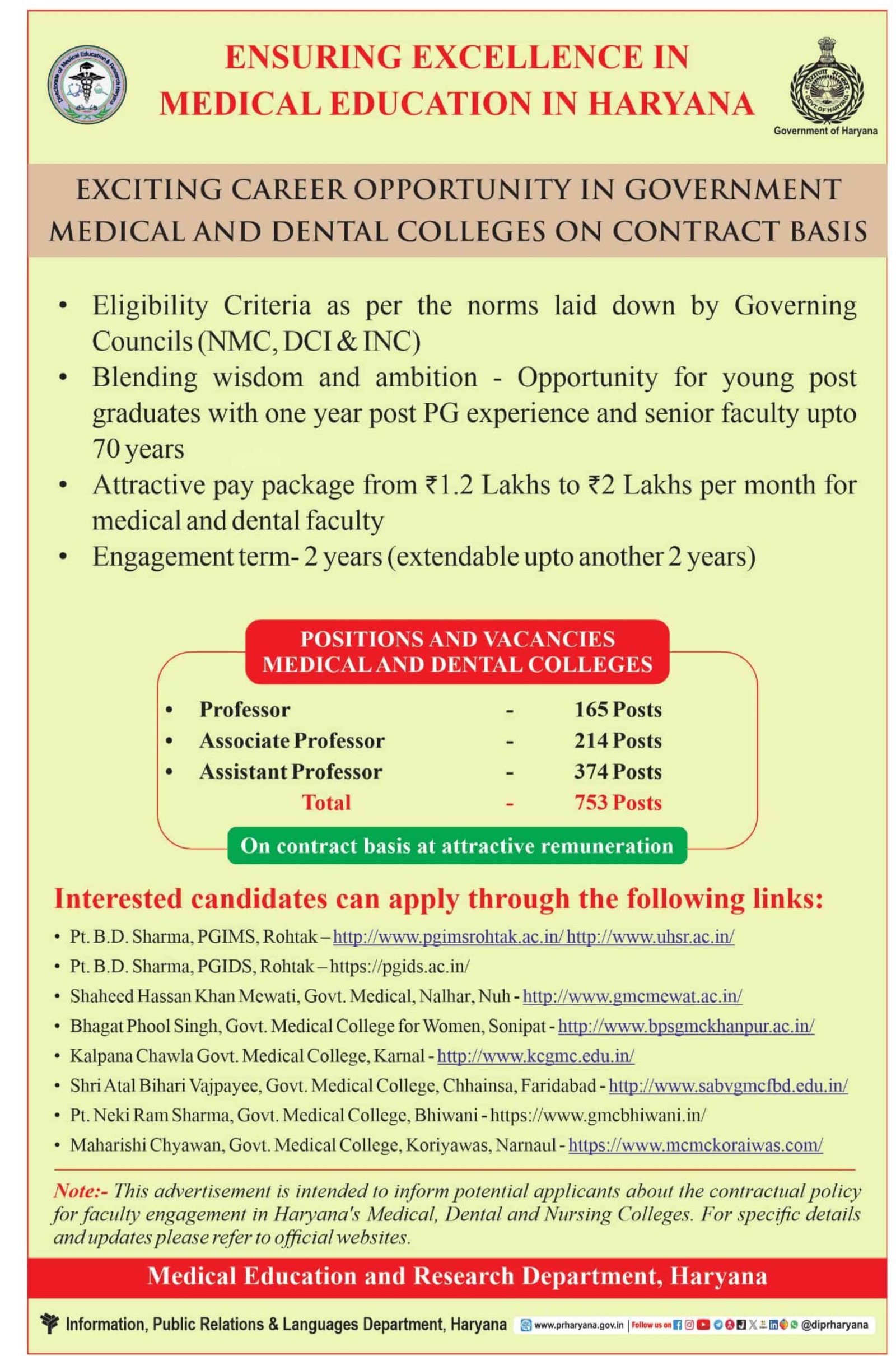 This is a great opportunity for candidates with medical teaching qualifications as per NMC norms to secure a high-paying faculty job in Haryana government medical colleges.