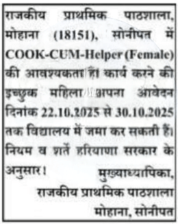 | Mid Day Meal Helper (Cook) | 5Th Pass + खाना बनाने का अनुभव | Government Primary School, Mohana (18151), Sonipat |