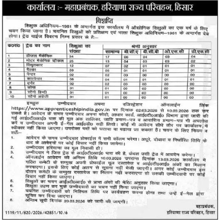 Haryana Roadways Hisar District Apprentice 2026: The General Manager, Haryana Roadways, Hisar has released a notification for the ITI Trade Apprentice Online Form 2026 for 93 vacancies. Only Haryana candidates can apply for this form. Interested and eligible candidates can fill out the online application form from 02 March 2026. Complete details regarding the notification, eligibility, qualification, age limit, salary, apply online process, important dates, application fee, how to apply, exam date, admit card, answer key, syllabus, result, previous papers, etc., are provided below