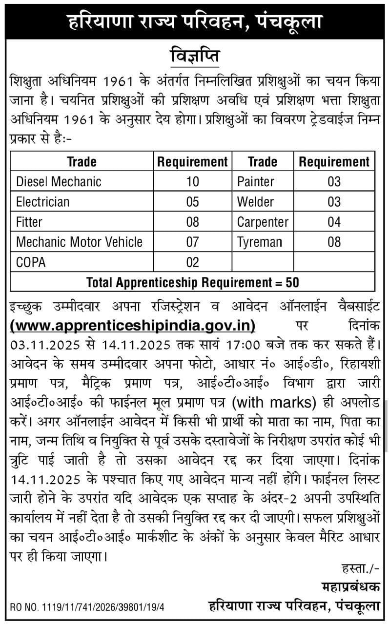 Haryana Roadways Panchkula Apprentice Recruitment 2025 : The General Manager, Haryana Roadways, Panchkula Depot has released a notification for ITI Trade Apprentice Online Form for 50 apprentice vacancies. Only candidates from Haryana can apply for this form. Interested and eligible candidates can fill out the online form from 03 November 2025.