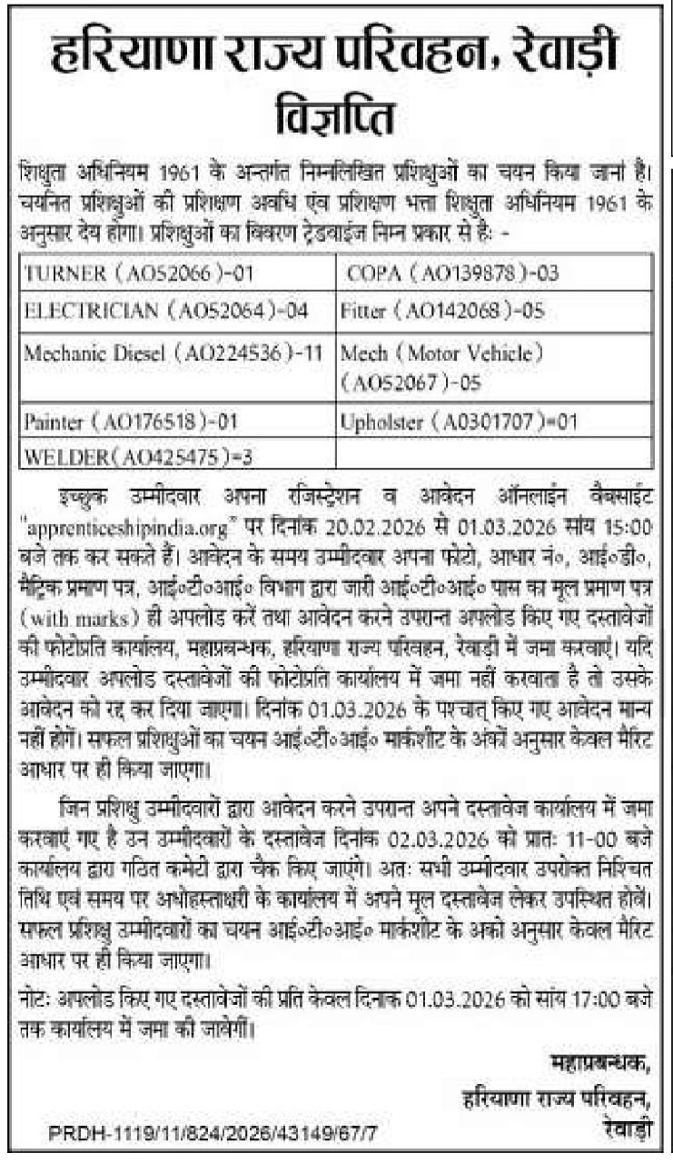 Haryana Roadways Rewari District Apprentice 2026: The General Manager, Haryana Roadways, Rewari has released a notification for the ITI Trade Apprentice Online Form 2026 for 34 vacancies. Only Haryana candidates can apply for this form. Interested and eligible candidates can fill out the online application form from 20 February 2026.