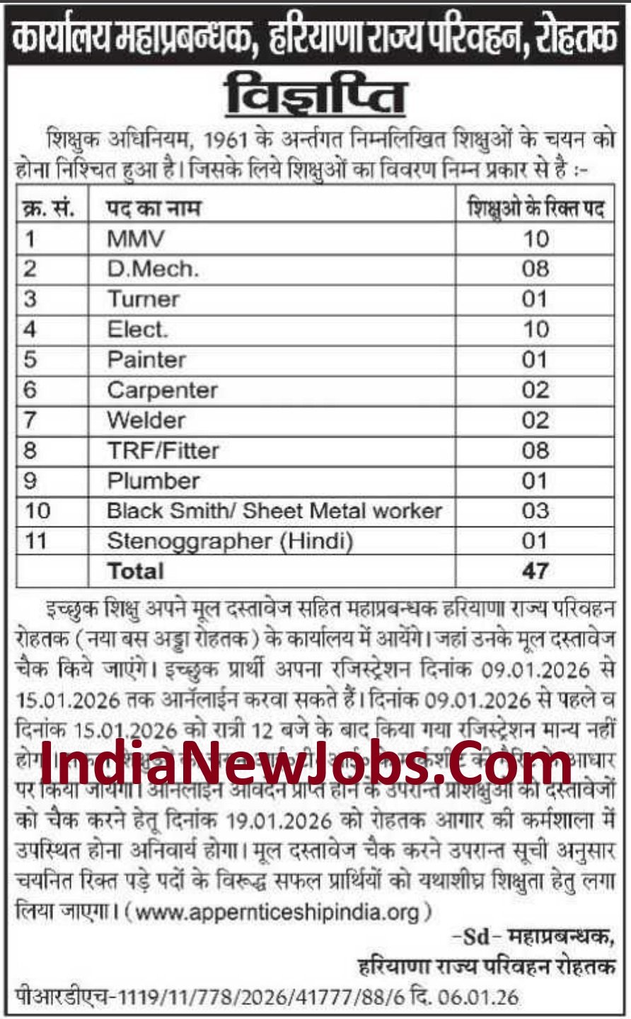Haryana Roadways Rohtak Apprentice Recruitment 2026: The General Manager, Haryana Roadways, Rohtak Depot has released a notification for ITI Trade Apprentice Online Form for 47 apprentice vacancies. Only candidates from Haryana can apply for this form. Interested and eligible candidates can fill out the online form from 09 January 2026.