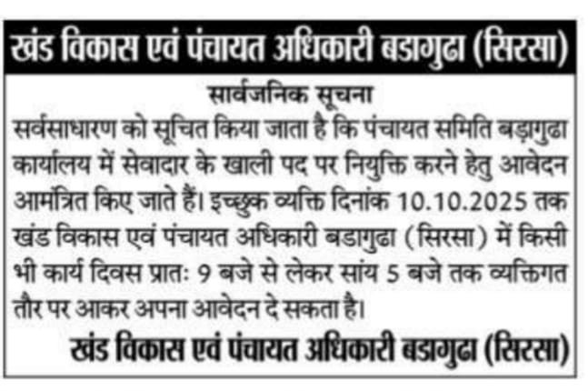 Haryana Sewadar Vacancy 2025: Block Development and Panchayat Officer Office, Baraguda (Sirsa) invites applications for Sewadar (सेवादार) post on a contract basis for vBaraguda (Sirsa) District. All qualified and interested candidates can fill out the offline form from 05 October 2025. The last date for submission of offline applications is given below, and all eligible candidates will fill out the form on the mentioned dates.