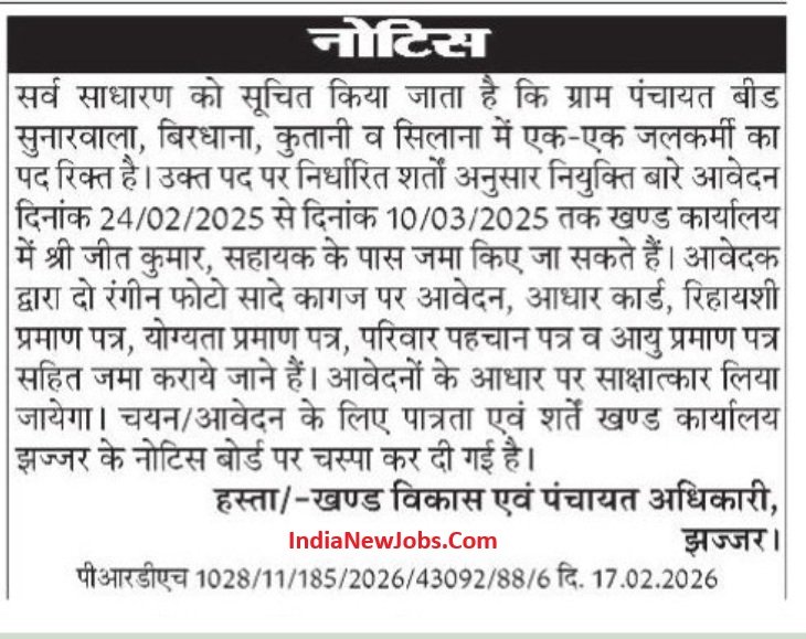 Haryana Tubewell Operator Vacancy 2026: Block Development and Panchayat Department, Jhajjar (District. Jhajjar) invites applications for Tubewell (जलकर्मी) Operator on a contract basis for various villages of Jhajjar District. All qualified and interested candidates can fill out the offline form from 24 February 2026. The last date for submission of offline applications is Various Village Wise, and all eligible candidates will fill out the form on the mentioned dates.