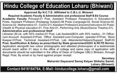 Hindu College Of Education Bhiwani Vacancy 2026 Eligibility Detail