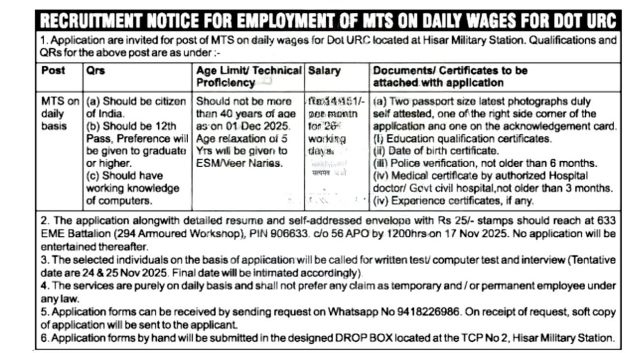 Hisar Military Canteen Vacancy 2025 The Haryana DOT Army URC Canteen Hisar has released the latest notification for the recruitment of MTS posts Offline Form For All India Candidates. Eligible Indian male and Female candidates can apply offline for the Hisar Military Canteen Recruitment 2025 from the DOT Army Official website CSDindia.gov.in starting from 13 November 2025. All the details related to Hisar Military Canteen Bharti 2025 are given below.