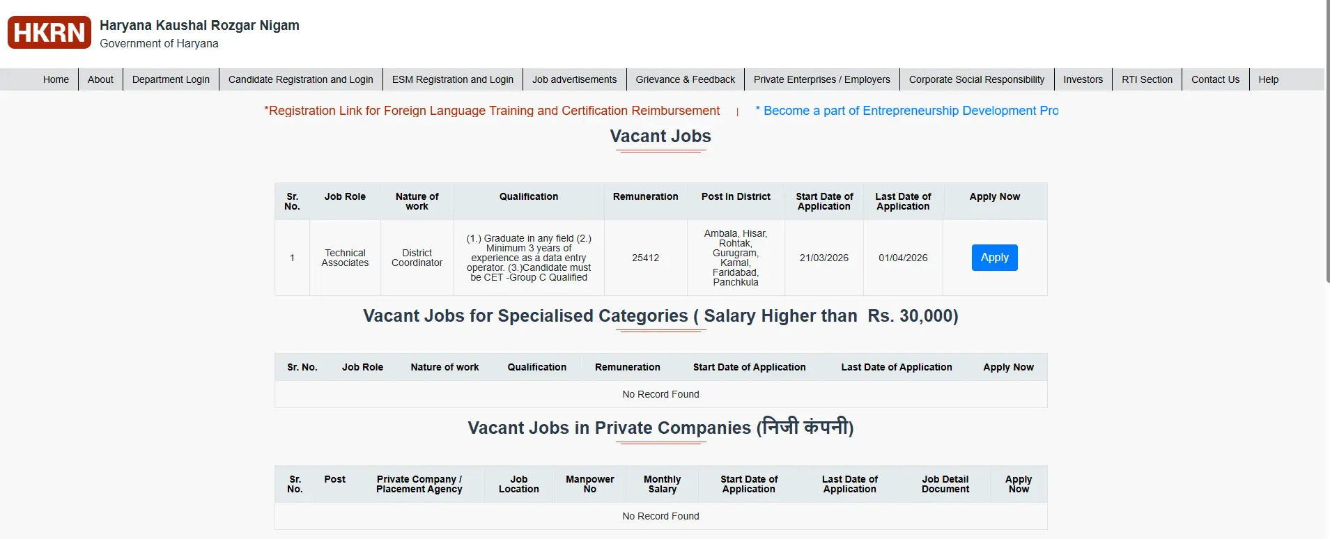 - Click on the Apply Online Link given below or visit the website https://hkrnl.itiharyana.gov.in/VacantJobs