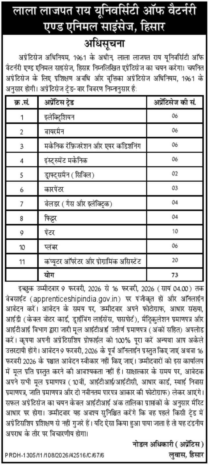 LUVAS University Hisar Apprentice 2026: Lala Lajpat Rai University of Veterinary and Animal Sciences (LLRUVAS), Hisar has invited online applications for Apprenticeship Training 2026 under the Apprentices Act, 1961. A total of 73 apprenticeship vacancies are available across various trades including Electrician, Wireman, Mechanic Refrigeration & Air Conditioning, Instrument Mechanic, Draughtsman (Civil), Carpenter, Welder, Fitter, Painter, Plumber, and Computer Operator & Programming Assistant (COPA).