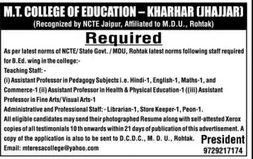 M.T College of Education Jhajjar Recruitment 2026 Eligibility Detail