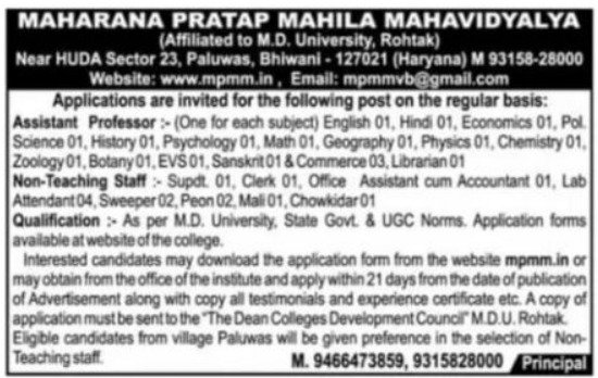 - Now send this application form to “Maharana Pratap Mahila Mahavidyalaya, Huda Sec-23, Meham Road, Paluwas, Bhiwani-127021, Haryana“