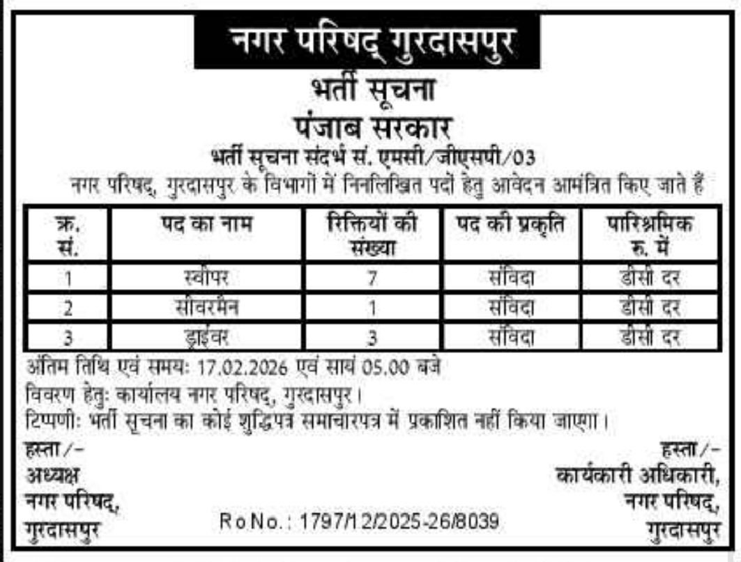 Municipal Council Gurdaspur Recruitment 2026: The Municipal Council Gurdaspur has released the latest notification for the recruitment of 11 Posts of Sweeper, Sewer Man and Driver Posts Contract Basis Posts online Form For All India Candidates. Eligible candidates can apply offline for the Muncipal Council Gurdaspur Vacancy 2026 starting from 11 February 2026. All the details related to Muncipal Council Gurdaspur Bharti 2026 are provided below.