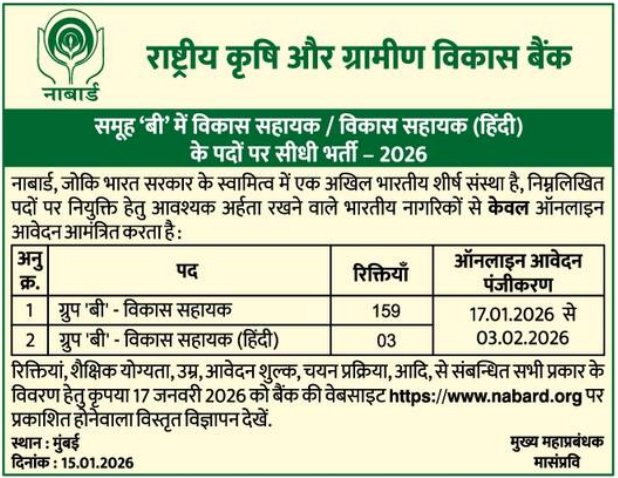 NABARD Development Assistant Recruitment 2026 Notification Online Form: The National Bank for Agriculture and Rural Development (NABARD) has released a notification for the recruitment of 162 Development Assistant (DA)/ Development Assistant (Hindi) Group-B posts. Eligible candidates can apply online through the NABARD official website, nabard.org, starting from 17 January 2026. The notification for the recruitment was released on 15 January 2026. All the details related to NABARD Development Assistant 2026 are given below.