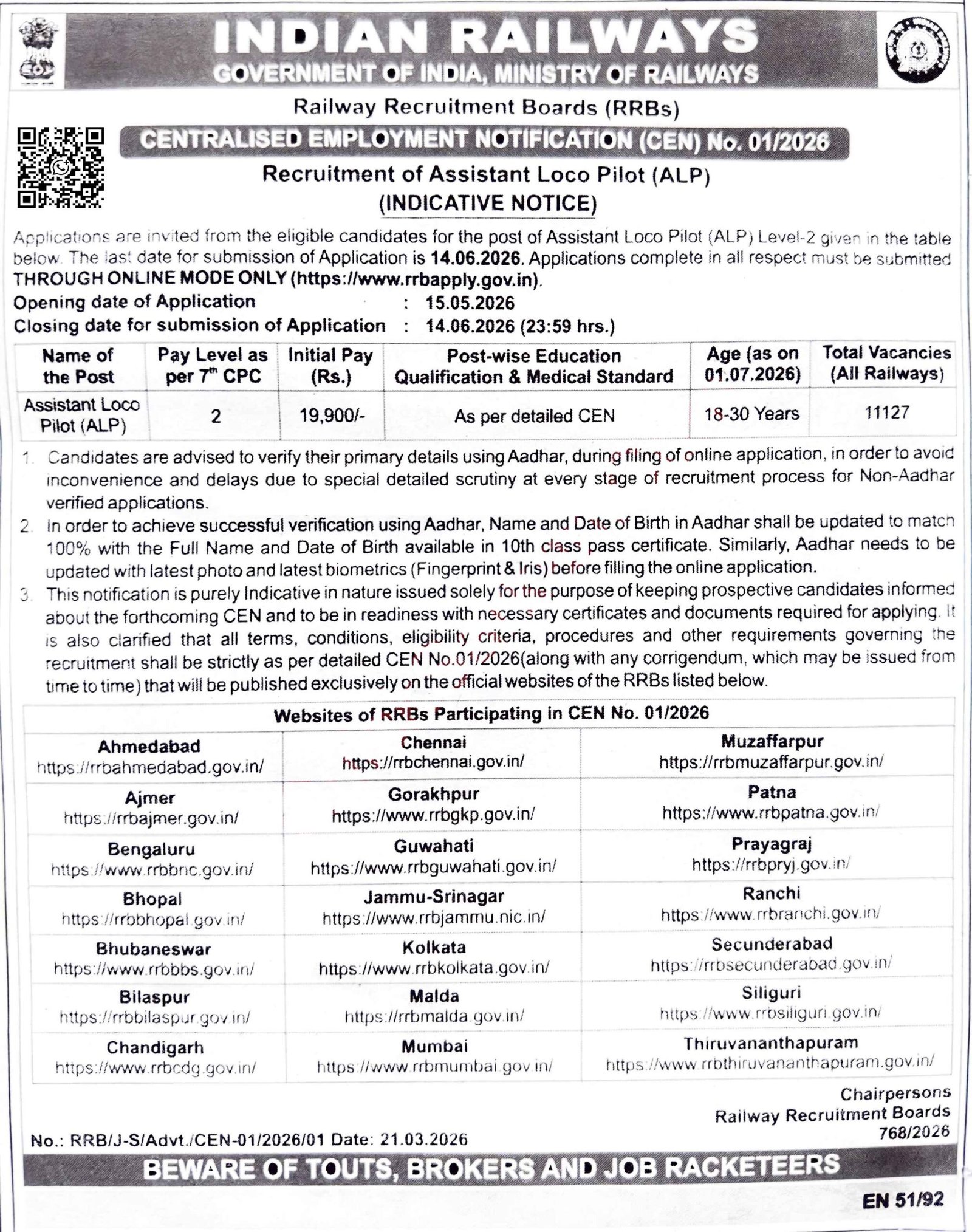 - Check the eligibility from the RRB ALP New Vacancy Notification 2026-27