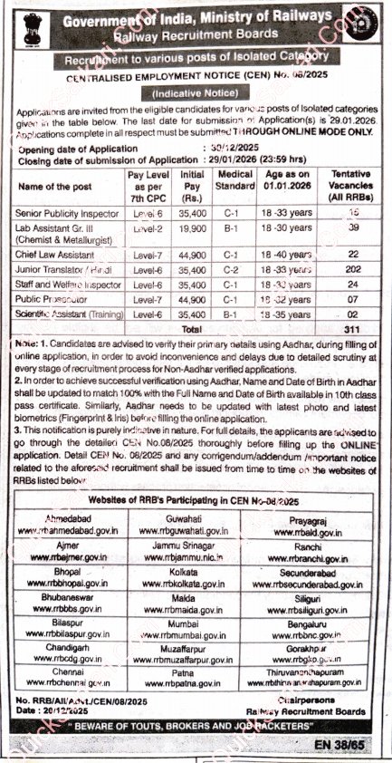 Age Limit: The age limit to apply for RRB Isolated Category Recruitment CEN 08/2025 Is 18-33 Years Old (Varies Post-wise). The cutoff date for the calculation of the age limit is 01 January 2026. The age relaxation will be given as per the rules.