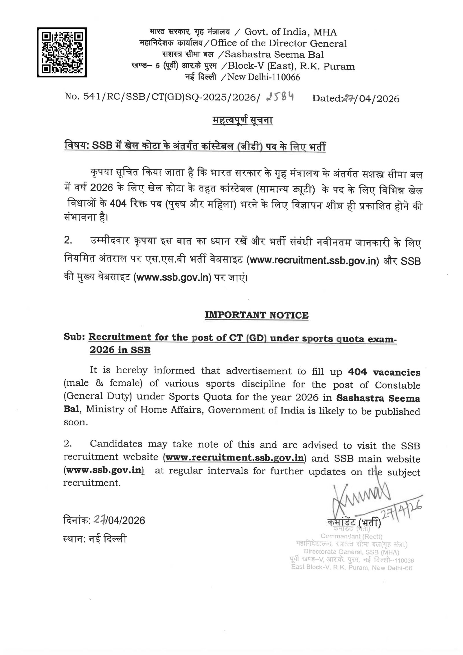 SSB Constable GD Sports Quota Vacancy 2026: The Sashastra Seema Bal (SSB) has released the latest notification for the recruitment of Constable (GD) Sports Quota posts. According to the official notification, a total of 404 vacancies have been announced. Eligible candidates can apply online through the official recruitment portal before the last date.