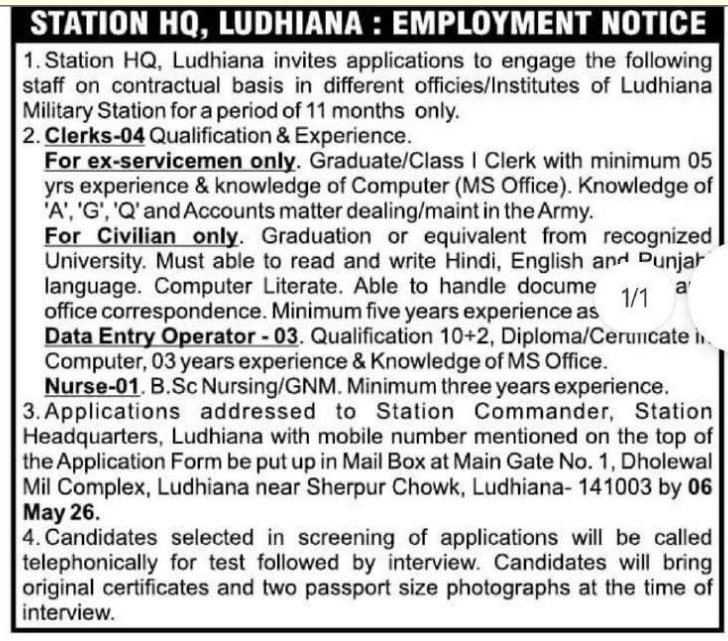 Station HQ Ludhiana Recruitment 2026: The Station Headquarters Ludhiana has released an official notification to engage staff on a contract basis for 11 months in different offices/institutes under Ludhiana Military Station. Interested and eligible candidates can apply offline before the last date.